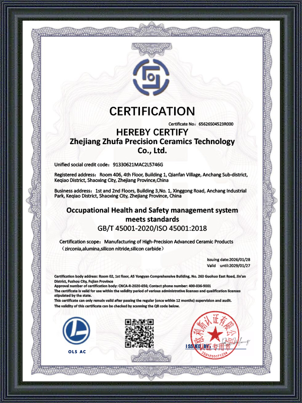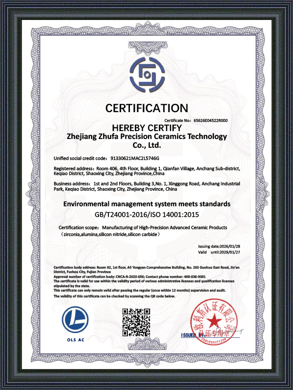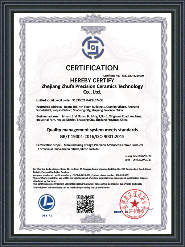 Zhejiang Zhufa Precision Ceramics Technology Co., Ltd. has a professional and efficient technical team, whose members cover the fields of materials, machinery, precision processing, etc. The core personnel have rich experience in ceramic research and development and engineering practice. We focus on non-standard customization and provide full-process technical support from design and proofing to batch delivery. The Zhufa team provides customers with reliable ceramic solutions with a rigorous, innovative and collaborative spirit.