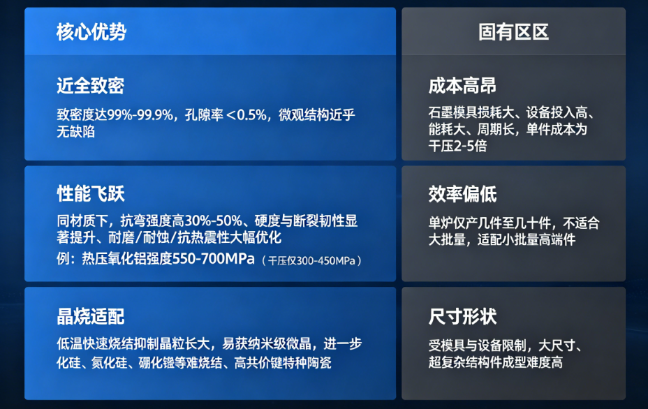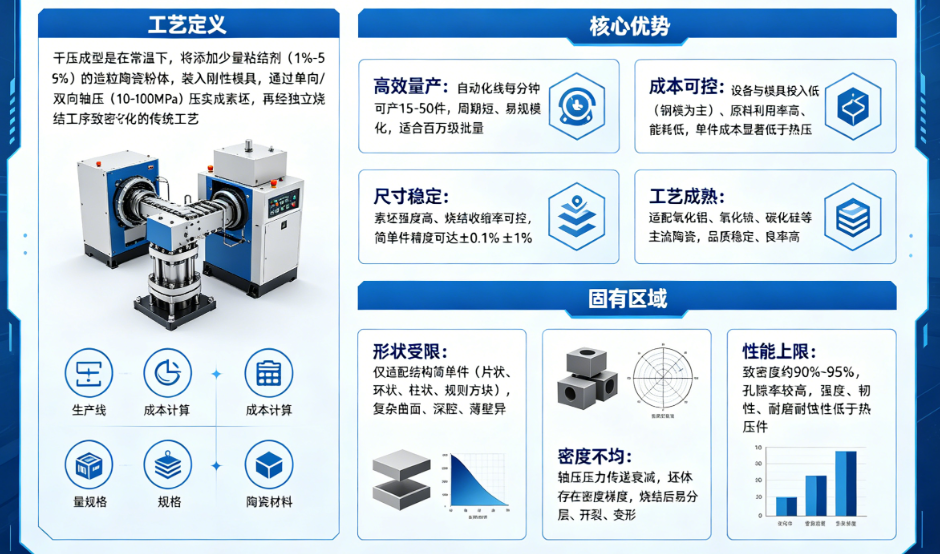 In the field of high-end manufacturing and industrial precision components, Industrial ceramics Just because of it High temperature resistance, wear resistance, corrosion resistance, excellent insulation With irreplaceable properties, it has become a core material that can replace metals and plastics. The key to determining the final performance, cost and delivery time of ceramic components is, first of all, Molding process . Facing the mainstream of the market dry press molding with Hot press forming With the two major technical paths, how can B-side customers accurately select products based on their own product needs? This article provides you with an in-depth analysis of process principles, core features, applicable scenarios and selection logic. 1. Full analysis of the two major process principles and core characteristics 1. Dry press molding: a standardized choice for efficient mass production process definition Dry press molding is normal temperature Next, add a small amount of binder (1%-5%) to the granulated ceramic powder, put it into a rigid mold, and pass it through Unidirectional/bidirectional axial pressure (10-100MPa) It is a traditional process of compacting into a blank and then densifying it through an independent sintering process. 2. Hot press forming process definition Hot pressing is Integrated molding and sintering Advanced technology: in Vacuum / protective atmosphere , put the powder into a high-temperature resistant mold (mainly graphite), and apply it simultaneously High temperature (1400-2200℃) High pressure (20-40MPa) , the powder is rapidly densified in the thermoplastic flow, and nearly fully dense ceramics are formed in one step. 2. Dry Pressing vs Hot Pressing: Comparison Table of Core Dimensions | | dry press molding | Hot press forming | | Process principle | normal temperature轴压成型 独立烧结 | High temperature and high pressure synchronization, integrated molding and sintering | | Density | 90%-95% theoretical density | 99%-99.9% theoretical density | | Mechanical properties | Strength 300-450MPa, average toughness | Strength 550-1200 MPa, high toughness and high wear resistance | | Shape adaptation | Simple structures (sheets, rings, columns, blocks) | Simple - medium complex, Performance first scene | | Production efficiency | Extremely high (automated mass production) | Low (small batch/single piece customization) | | comprehensive cost | Low (excellent mold, energy consumption, cycle time) | High (high costs for molds, equipment, and energy consumption) | | Applicable materials | Alumina, zirconia, ordinary silicon carbide | Silicon nitride, high-density silicon carbide, zirconium boride and other special ceramics | | Typical accuracy | | ±0.05%-±0.5% (post-processing can reach higher) | 3. Five core judgment dimensions for selection decisions 1. Look at product performance requirements (primary decision) Choose dry pressing: general industrial scenarios, medium requirements Strength, wear resistance, insulation, no extreme high temperature/high pressure/strong corrosion/high impact . Examples: ordinary mechanical bushings, insulating gaskets, conventional sealing rings, semiconductor structural parts. Choose hot pressing: extreme performance scenarios, requirements Ultra-high strength, high toughness, near-zero porosity, ultra-wear and corrosion resistance, high temperature creep resistance . Examples: aerospace components, high-end cutting tools, oil drilling nozzles, automotive engine precision parts, bulletproof armor, semiconductor wafer suckers. 2. Look at the product structure complexity - Choose dry pressing: simple structure, regular and symmetrical, no deep cavity, thin wall, undercut, complex curved surface, wall thickness >1mm.